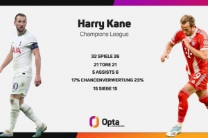 体育资讯10月1日讯 根据统计,凯恩为拜仁出战26场欧冠,已经打入了21粒进球,这一数字已经追平了他在热刺效力期间32场欧冠比赛的总进球数。