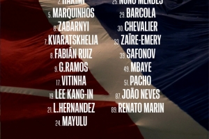 巴黎欧冠大名单:2-阿什拉夫、5-马尔基尼奥斯、6-扎巴尔尼、7-克瓦拉茨赫利亚、8-法比安-鲁伊斯、9-贡萨洛-拉莫斯、17-维蒂尼亚、18-李刚仁、21-卢卡斯-埃尔南德斯、24-马尤卢、25-努诺-门德斯、29-巴尔科拉、30-舍瓦利耶、33-小埃梅里、39-萨福诺夫、49-姆巴耶、51-帕乔、87-若昂-内维斯、89-马林