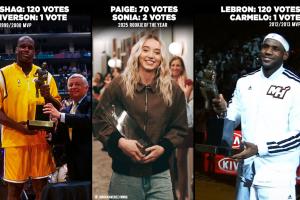 1999-2000赛季MVP,奥尼尔收获了121张选票中的120张选票,艾弗森获得另外一张MVP选票