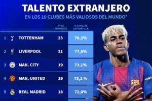 体育资讯9月18日讯 德国转会市场统计了身价排名前十俱乐部的外籍球员占比,并列出榜单,在身价前十俱乐部之中,热刺外援占比79.3%最高,巴萨43.5%最低。