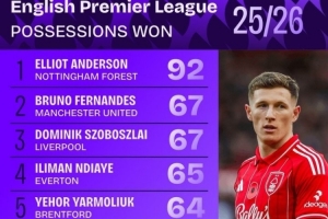 本赛季英超赢得球权榜:安德森断崖领跑,B费、索博、凯塞多在列