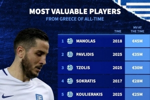 希腊球员历史身价排名:马诺拉斯4500万欧居首,帕夫利季斯次席