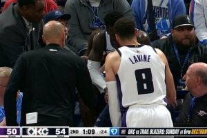 GIF-德罗赞战斧劈扣扣飞,施罗德救球踢翻电脑,飞到观众席