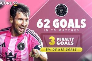梅西:迈阿密国际75场62球,3点球,占比5%