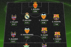 体育资讯9月22日讯 西甲第五轮战罢,数据网站Whoscored也评选出本轮西甲最佳阵,费兰等巴萨3人在列,米利唐如选。以下为具体阵容: