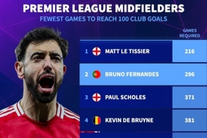 据德国转会市场统计,B费已为曼联打进100球,英超时代只有8名中场球员为俱乐部(所有赛事)打进100球,而B费是所用场次第2少的中场球员。