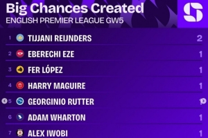 英超第5轮创重大机会榜: