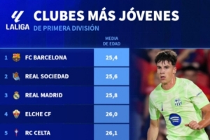 体育资讯9月24日讯 德转统计了本赛季西甲球队的平均年龄榜,巴萨平均年龄25.4岁最年轻,皇马25.8岁第三年轻。